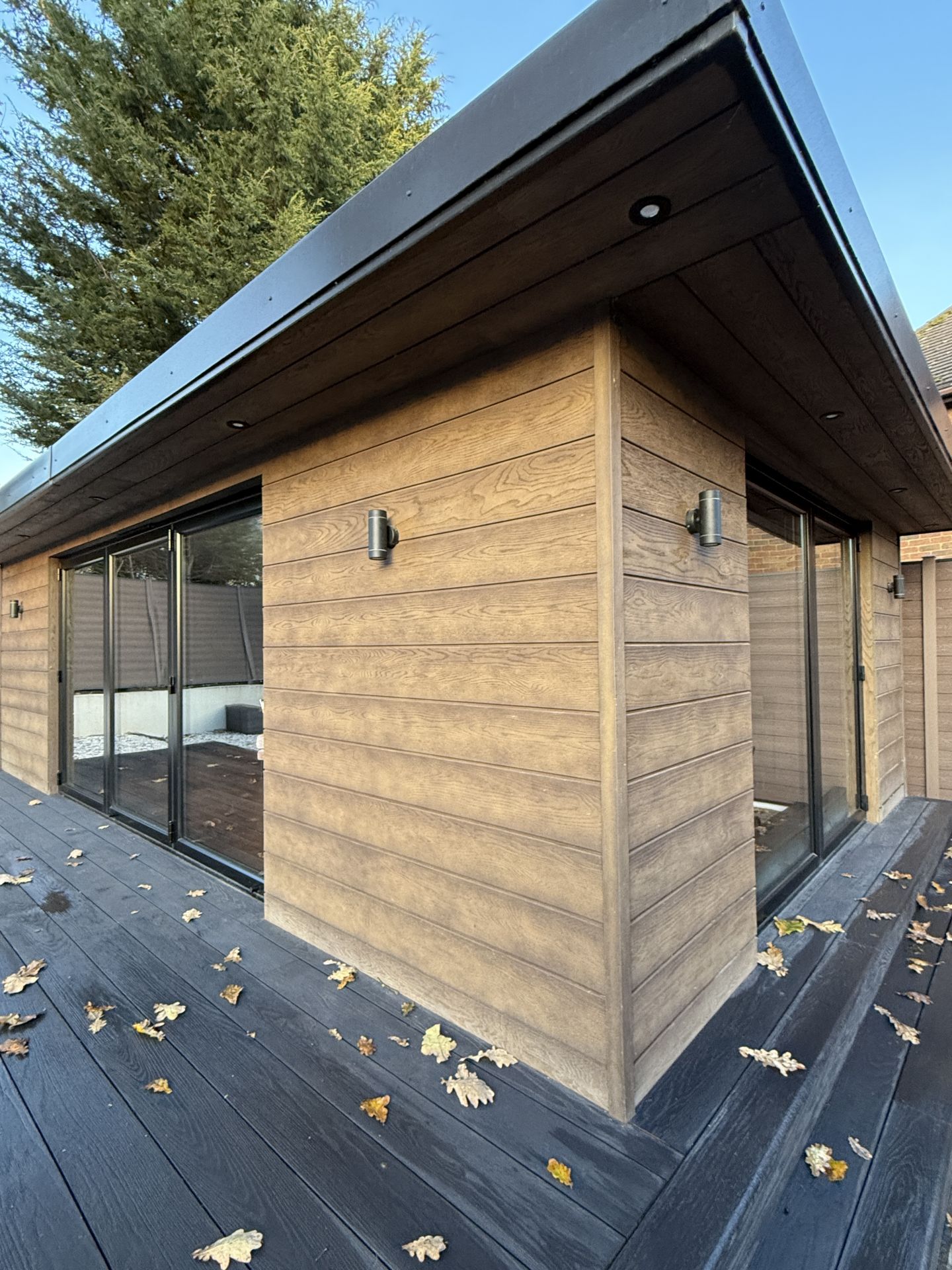 This makes it an ideal choice for high-exposure areas, busy households, or clients who want the beauty of timber with long-term durability and minimal intervention. Its colour consistency and structural stability mean your garden room maintains a refined, modern appearance through every season. Made from recycled materials and engineered for strength, composite cladding is both sustainable and built to last, a reliable, contemporary option that balances performance with timeless design.
